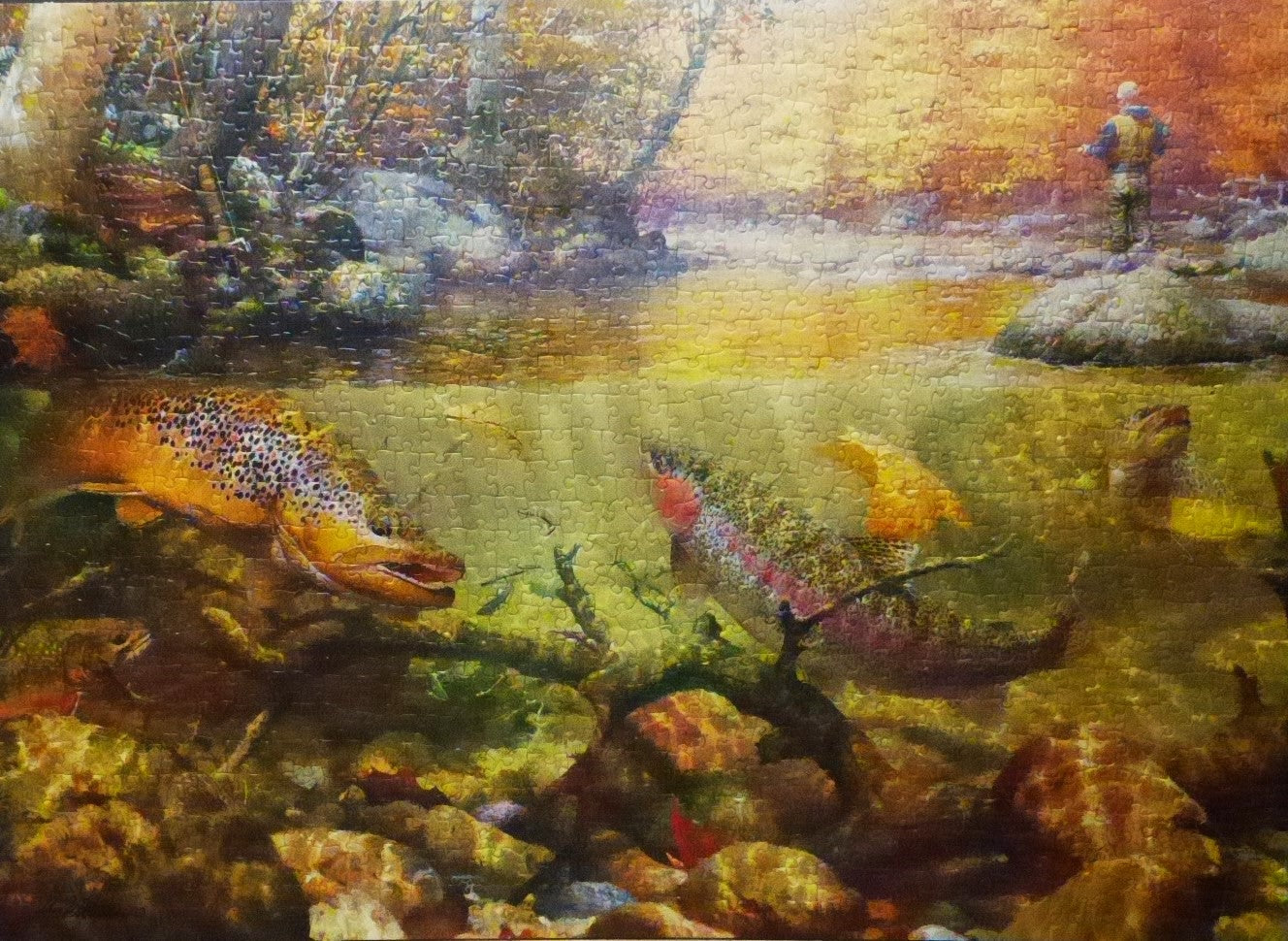 My latest puzzle is a 1000-piece titled Autumn Dream Day by Mark Susinno. Before I spend the time putting a puzzle together, I must have a connection to it. My connection to this puzzle is my interest in trout fishing.