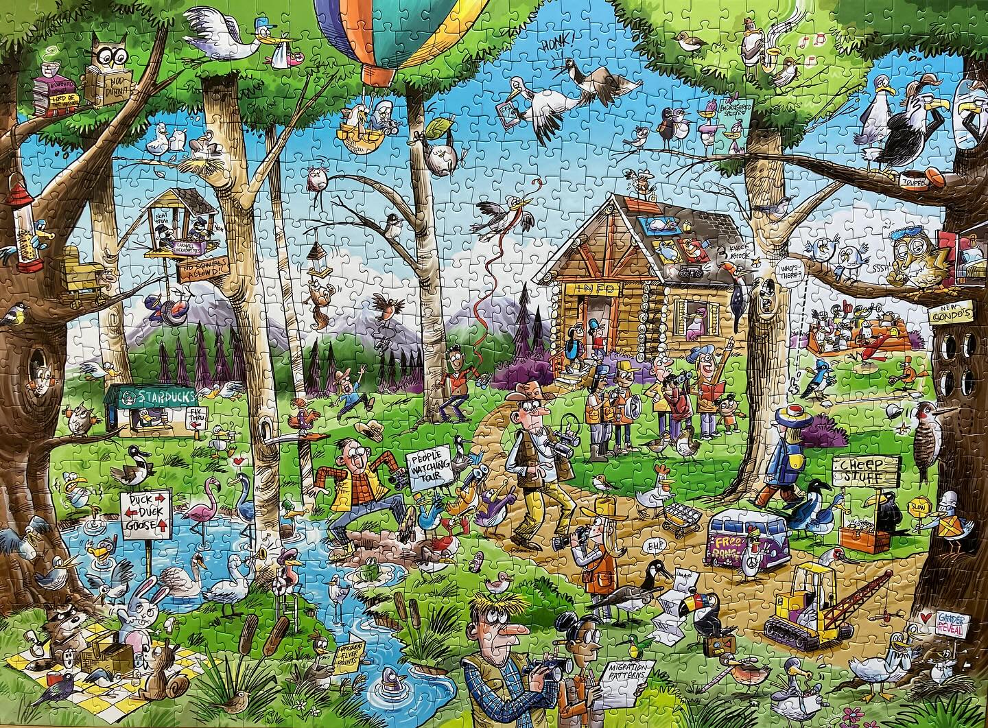 David Manga, owner: Of course, the subject matter needs to be popular enough that lots of people will want to assemble a puzzle with that particular subject matter. But the subject also has to lend itself to having lots of fun things going on. Take for example "Birdwatcher’s Paradise". We know bird puzzles are popular, but just think of all the shenanigans that can happen when people are out in nature looking for birds. What really makes a DoodleTown image a DoodleTown image is all those funny interactions.