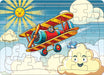 A biplane is taking a Happy Flight across the blue skies. With the happy cloud smiling up at the plane and the sunshine looking so bright, this is sure to be a great journey!