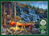 Experience the serenity of The Waterfall Camp, a 1000 piece puzzle by artist Darrell Bush. Set under a crescent moon and a canopy of stars, the scene glows with the warmth of a campfire beside a calm lake. A canoe leans against the shore, its oars stacked neatly while a jacket and satchel hang nearby - subtle clues that this is a solo adventure. In the distance, a gentle waterfall flows over rugged rocks surrounded by vibrant autumn trees. From the resting coffee pot to the soft firelight dancing across the water, every detail evokes the peace and wonder of a perfect night outdoors.