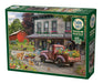 A lovely Country Store where kids can go to buy candy and flowers for their mom. The Cobble Hill General Store is situated next to a big green grassy field where children can bring their dogs to play and swing on the tire swing that hangs from the great big tree. The Golden Retriever and puppies are there today watching the birds. It must be flower delivery day because the vintage rust red truck has a bed full of beautiful hanging planters and fresh cut flowers. A beautiful 1000 piece nostalgic country puzzle from Gred Giordano.