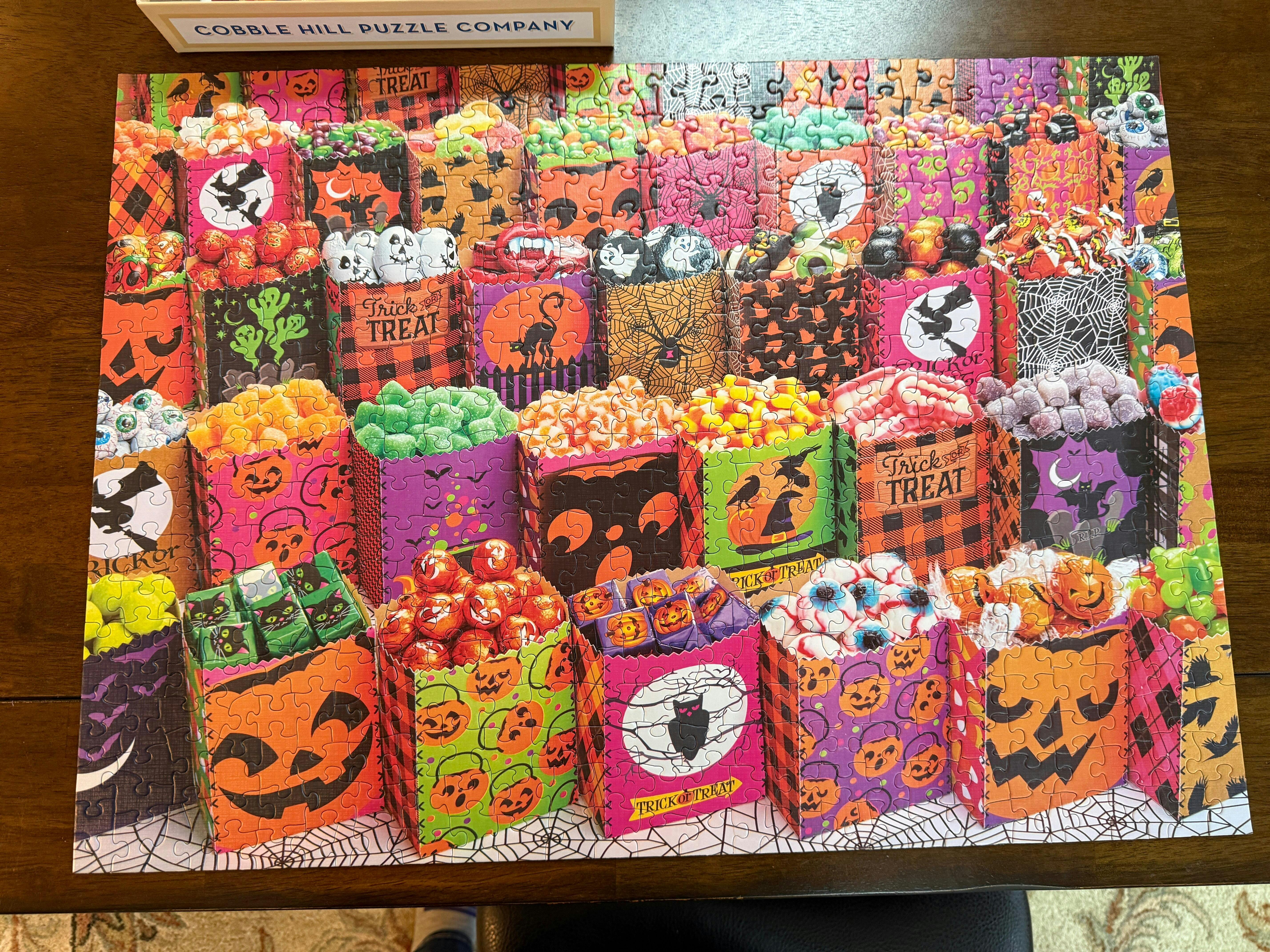 This colourful 500 piece Halloween Treats puzzle makes you want to stick your hand in a goodie bag and eat up all the sweets! Each goodie bag is decorated with a Halloween theme like pumpkins, bats, ghosts, spiders, and witches. The bags have delicious treats like chocolate skulls, candy corn, jujubes, jelly beans, gummy worms, and other candy confections that are definitely a treat - the only trick is you can't really eat it. Boooooo!