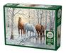 A group of gentle horses don't frighten the brilliantly colored cardinals on this clear winter's day.