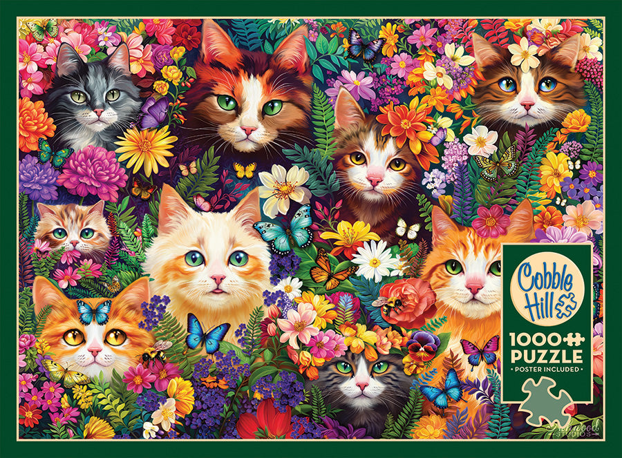 Observa los hermosos "Bigotes florecientes" en este divertido rompecabezas de 1000 piezas. Una escena encantadora de gatos enclavados entre una explosión de flores y mariposas coloridas. Los curiosos gatos te hacen preguntarte qué están mirando mientras miran a través de esta colorida variedad de flores. ¿Están cazando mariposas o algo más les ha llamado la atención? Un encantador rompecabezas de gatos de Brigid Ashwood.