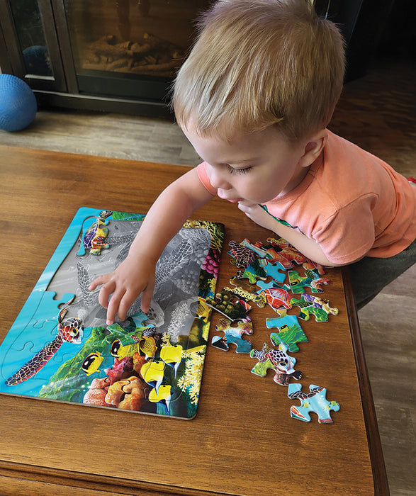Estas tortugas comparten amablemente el mundo submarino con sus amigos peces, mientras disfrutamos de la tranquilidad del rompecabezas azul profundo del mar de Molokini. Un rompecabezas de bandeja consta de piezas incrustadas duraderas en una bandeja con contornos definitivos debajo para ayudar a identificar dónde va cada pieza (ver imagen de muestra). Las piezas grandes facilitan el agarre de las manos y permiten que aquellos que necesitan más señales visuales vean una mayor parte de la imagen por pieza. Recomendado para mayores de 3 años.