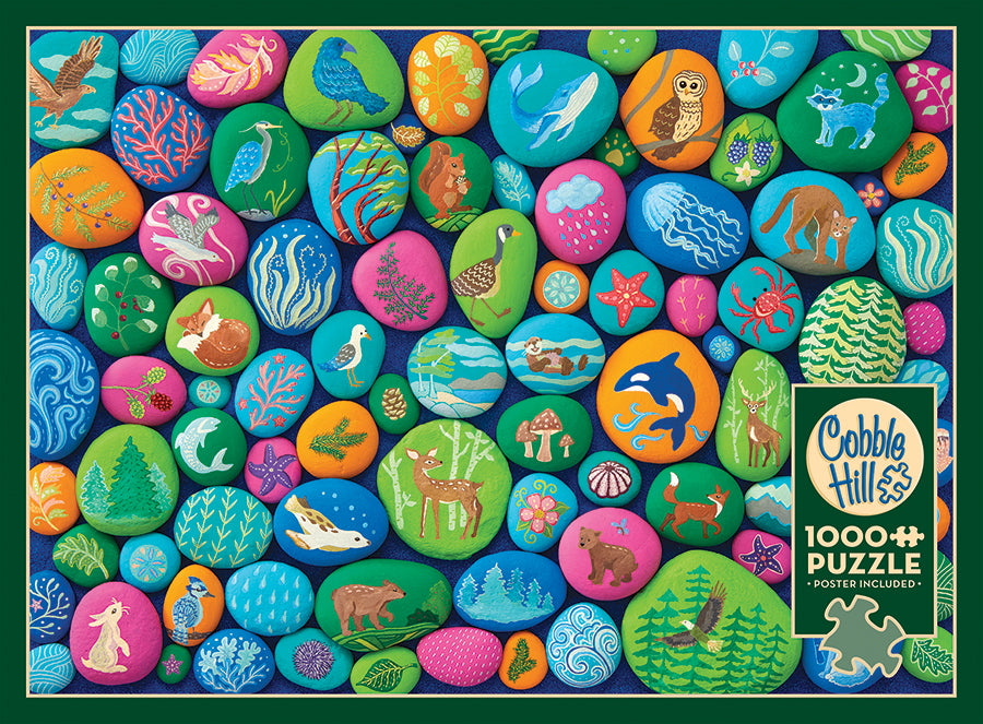 Sumérgete en las profundidades del noroeste y observa cómo se eleva tu espíritu. Colores frescos de verdes y azules con piedras bellamente pintadas que representan la vida marina, el bosque y las criaturas típicas del noroeste. Este es definitivamente un rompecabezas que querrás explorar incluso después de completarlo.