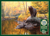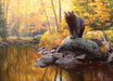 It’s always golden hour at Black Bear Pond, where autumn never fades and the light lingers in warm, glowing tones. This stunning 1000 piece jigsaw puzzle by artist Greg Alexander captures a quiet, powerful moment in nature: a solitary black bear perched on a weathered rock at the edge of a still pond, completely absorbed in something unseen above.