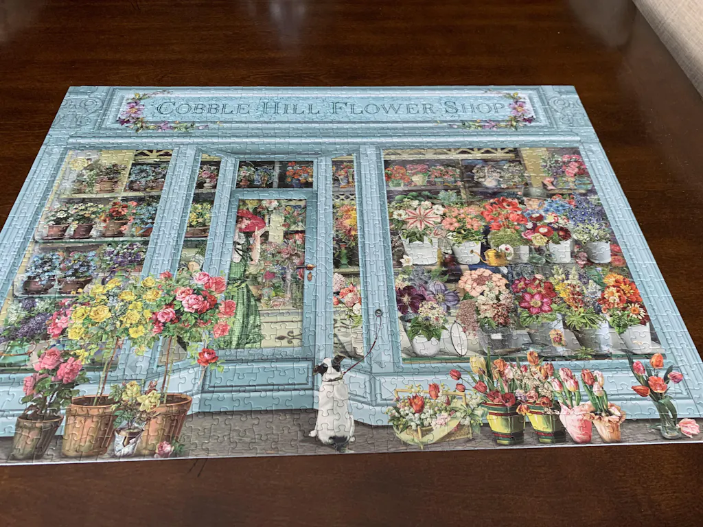 The Cobble Hill Flower Shop is open for business in this 1000 piece puzzle! Check out these arrangements of tulips, posies, violets, and roses. A curious dog awaits her owner outside as she buys the freshest blooms in all of Paris.
